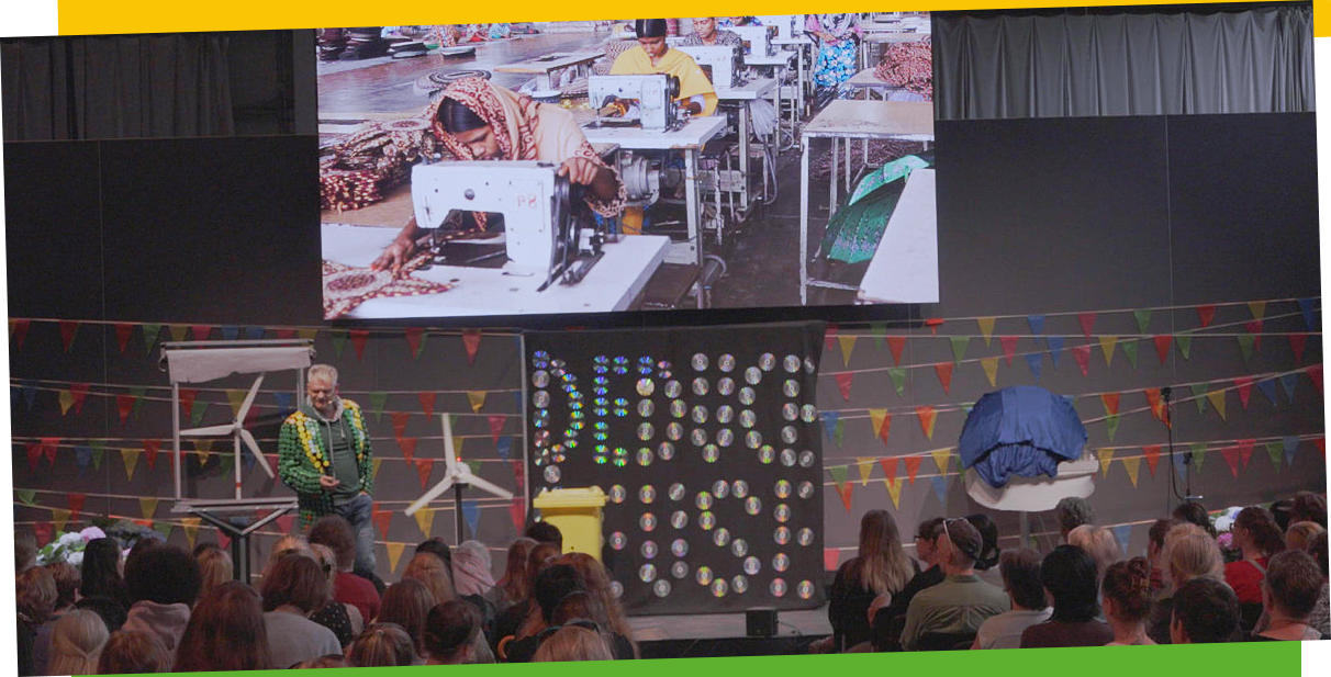 DieAusbeutungbilligerArbeitskräfteinEntwicklungsländerndientnurdazu,enormeGewinnezuerzielen. DiestreibtunsineinenKreislaufdesbilligenKonsums.GenauhiersetztdieZaubernummerdes UmweltmagiersüberdieKleiderindustriean.MitsarkastischemHumorbringterseinPublikumzumLachen – doch das Nachdenken bleibt im Halse stecken.DasGeheimnisdieserNachhaltigeKleidungShownummerliegtdarin,dieZuschauerohneerhobenen ZeigefingerzumNachdenkenanzuregen.BeimnächstenEinkaufsollensieanjenedenken,diediese Kleidunghergestellthaben.SowächstdasBewusstseinfürNachhaltigkeit.DennnurwennwiralsKunden aufhören, bestimmte Produkte zu kaufen, werden diese auch vom Markt verschwinden.